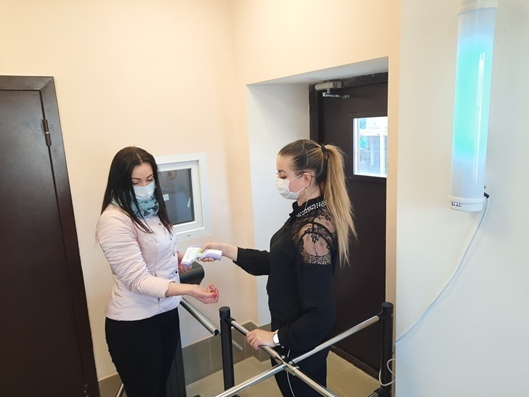 При входе на территорию предприятия у каждого сотрудника узнают о самочувствии, а так же измеряют температуру тела.